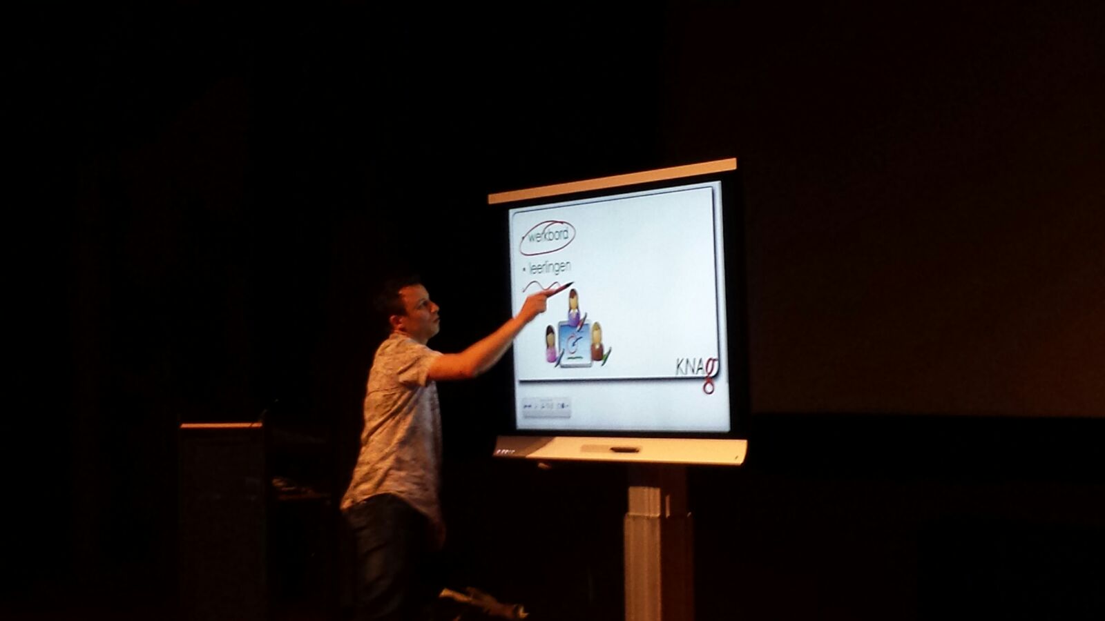 Vanwege de grote hoeveelheid aanmeldingen, mocht ik in de grote zaal m'n ding doen. Ik had zelf gezorgd via Techdata dat er een SMART Board 6065 (kapp iQ) in de zaal aanwezig was, want als ik wilde laten zien wat ik didactisch doe met dat digitale schoolbord in mijn SMART Collaborative Classroom, dan moet ik natuurlijk wel de touchgevoeligheid van het scherm kunnen laten zien. M'n focus lag op drie zaken. Het digitale schoolbord als: